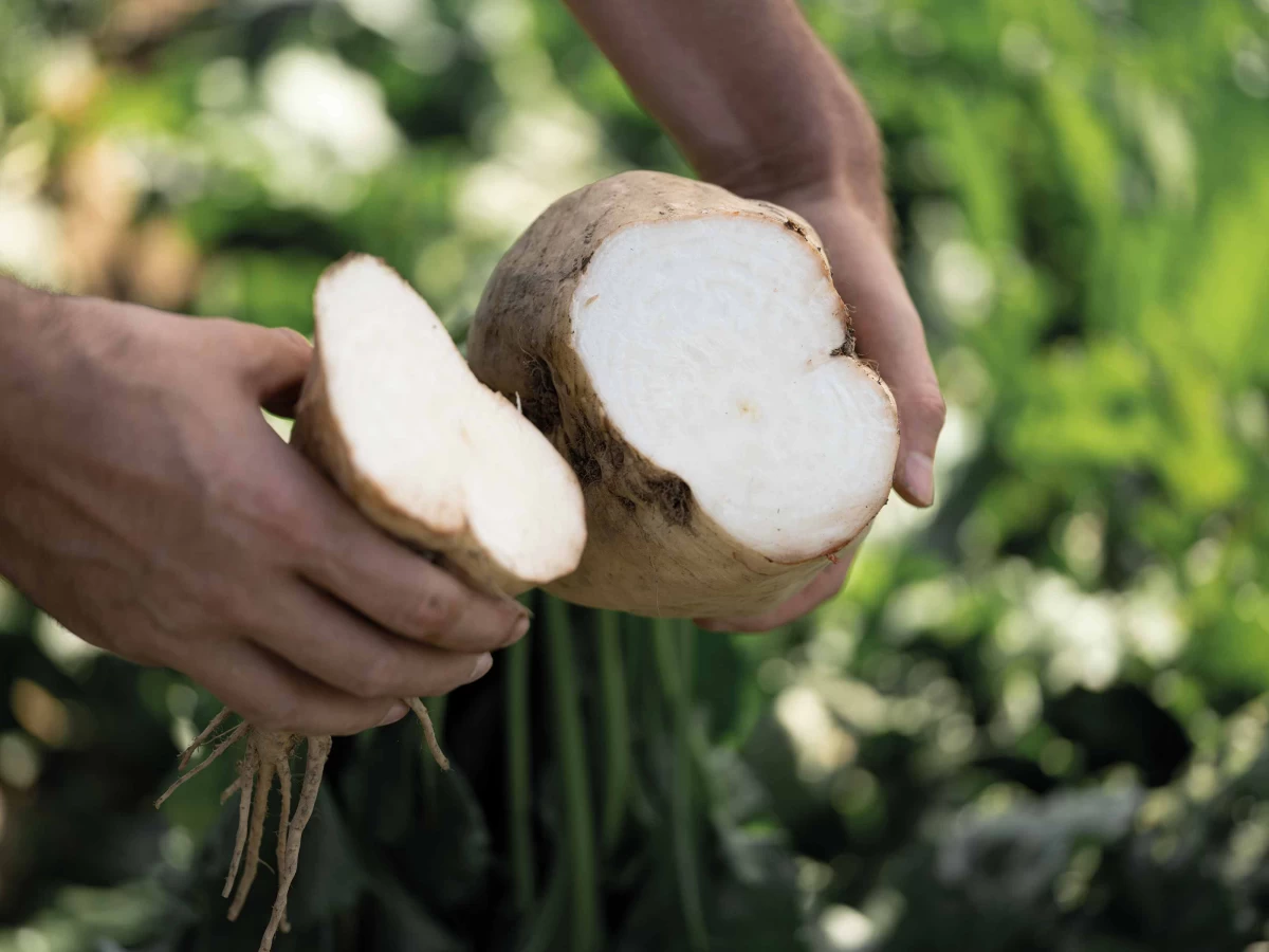 L’ensemencement des betteraves à sucre commence dès la fin mars. Progressivement, la plante développe une vingtaine de grandes feuilles grâce auxquelles elle réalise la photosynthèse. Au cours de ce processus, elle utilise la lumière du soleil pour transformer en sucre l’eau souterraine et le carbone présent dans l’air. Ce dernier est conservé dans la betterave, qui devient de plus en plus grosse. Pour assurer un approvisionnement suffisant en eau, la fine racine pivotante située à l’extrémité du corps solide de la betterave peut s’étendre jusqu’à plus d’un mètre et demi de profondeur. Il faut environ six mois à une petite graine pour se transformer en une majestueuse betterave.